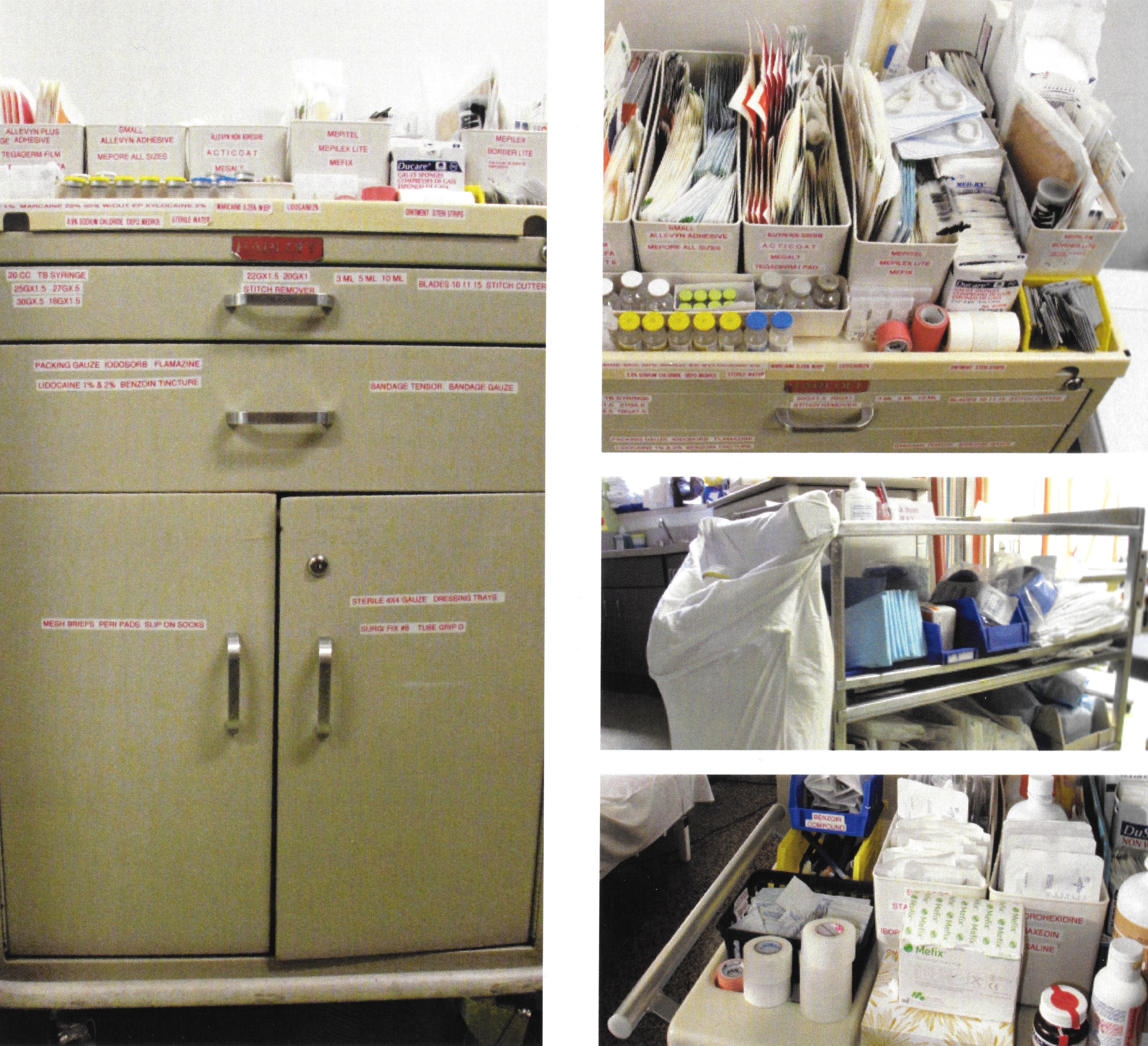 Carts lacked uniform labeling; manufacturers packaged supplies inconsistently, producing a disjointed visual language that forced staff to improvise within spatial constraints.