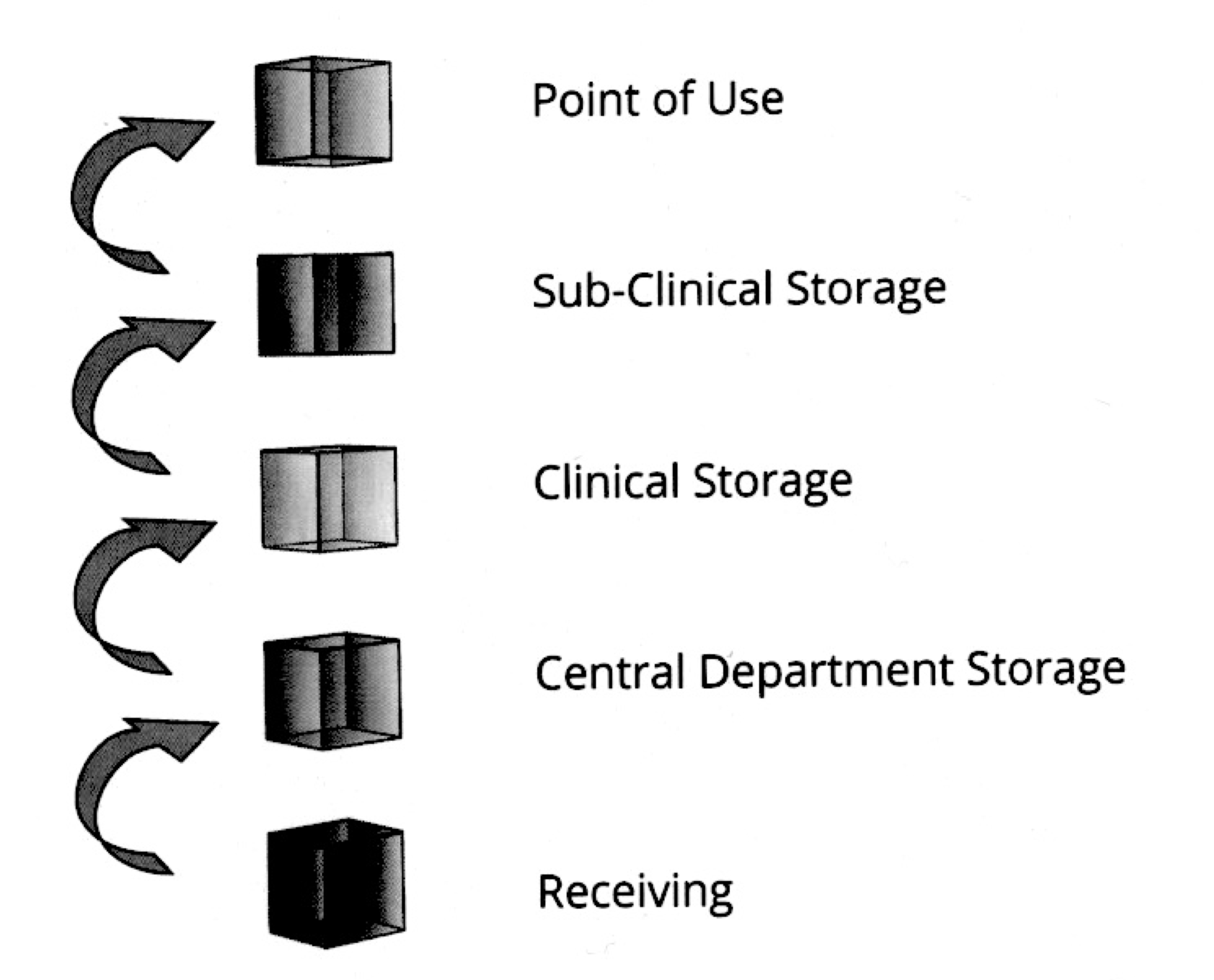 Receiving → Central Department Storage → Clinical Storage → Sub-Clinical Storage → Exam Room