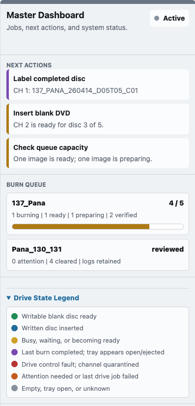 Each disc is produced as a verifiable artifact, with a traceable record of its contents and burn history, reducing the risk of silent failure within the archive.