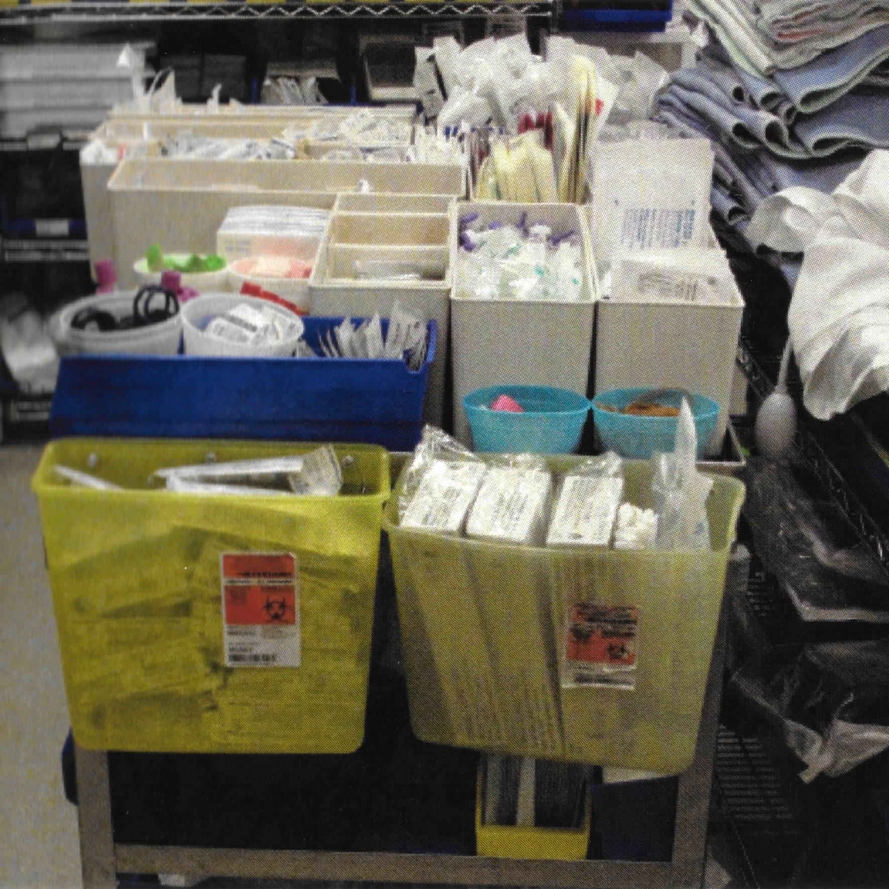 Carts lacked uniform labeling; manufacturers packaged supplies inconsistently, producing a disjointed visual language that forced staff to improvise within spatial constraints.